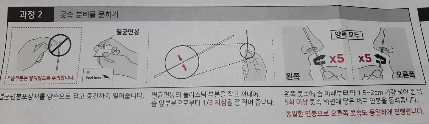 멸균된 면봉을 꺼내 왼쪽 콧속에 넣고